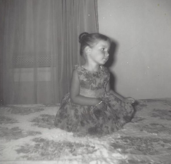 Se regarder dans le miroir. Les semaines avancent. La boîte de photos traîne au milieu du salon. La remettre au fond de la garde-robe. Oublier le corps que j’ai été. Je me penche pour remettre le couvercle, une photo, noir et blanc, je suis assise au centre d’un lit. Est-ce le lit de la chambre à coucher de mes parents ? je ne la reconnais pas. Mes jambes sont invisibles, repliées sous le tulle de la robe, mes petites mains potelées, une légèrement refermée, retenir quelque chose de l’invisible, la peur, l’insécurité. Qui prend la photo ? Est-ce là que tout commence ? Petite fille, femme. Je te place. Tu restes là. Ne bouge pas. Sois belle. Être objet à regarder. J’ai des pommettes (où sont-elles aujourd’hui ?). Les cheveux remontés en un chignon, la tête un peu penchée, les yeux au loin, est-ce la tristesse ? Suis-je perdue dans la rêverie, à me raconter des histoires ? Où vas-tu, petite fille, avec une si jolie robe à fleurs ?
