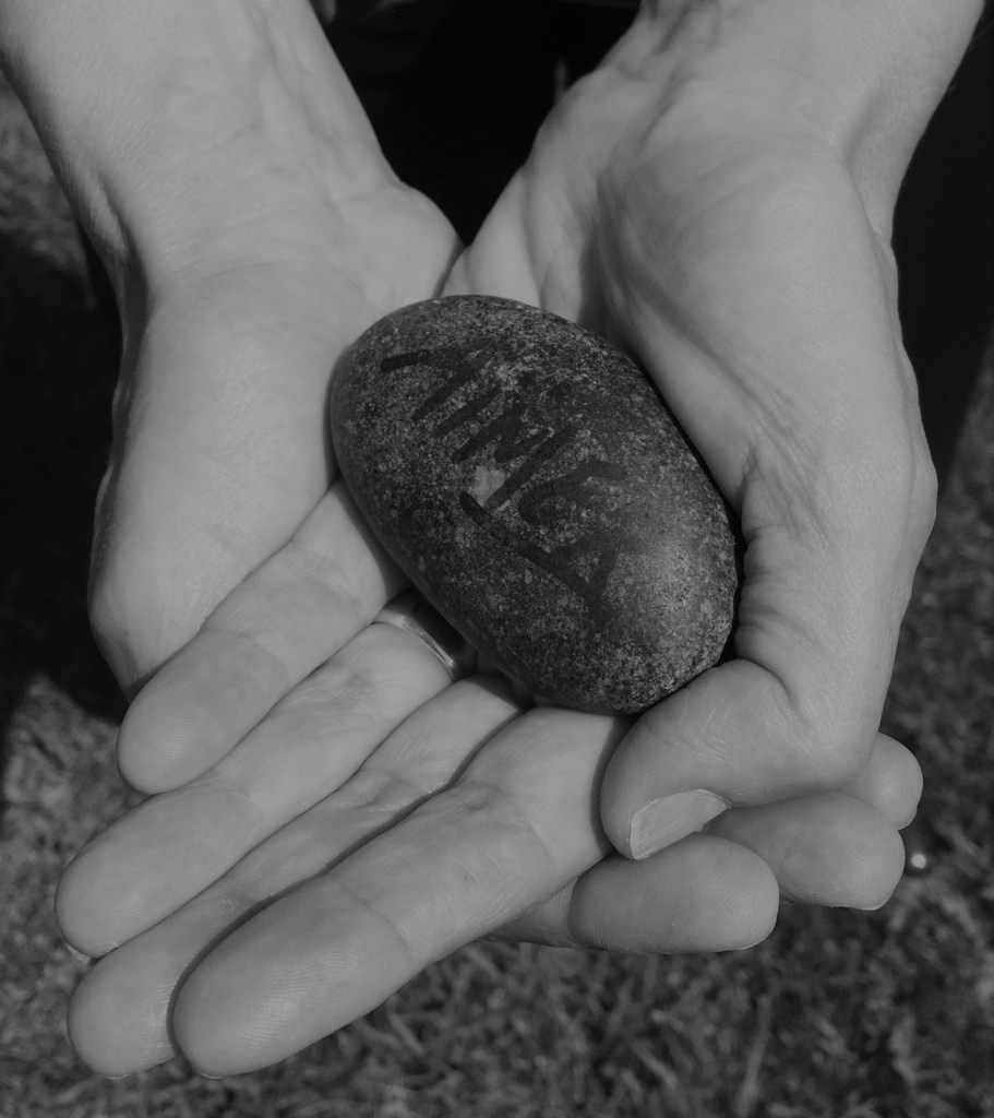 J’avais reçu cette pierre lors d’un rituel organisé par la Maison Monbourquette5 pour les personnes endeuillées. Nous étions une centaine de gens réunis dans une grande salle. Tous et toutes avions perdu.es un être aimé. Pour moi, c’était Mon Homme. À la fin du rituel, une pierre nous a été remise et on nous a posé la question suivante : « en un mot, quel est l’héritage laissé par la personne que nous pleurons ? »