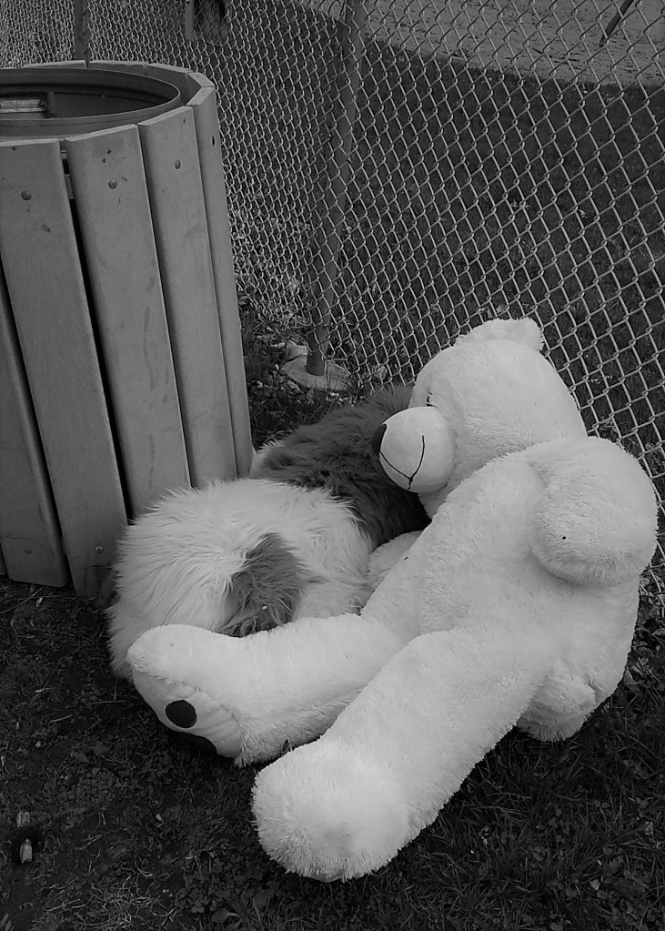 Lors d’une marche, en face d’un parc d’enfants, deux gros ours en peluche abandonnés près d’une poubelle. Pendant quelques secondes, je pense à les adopter. Je prends une photo à la place.