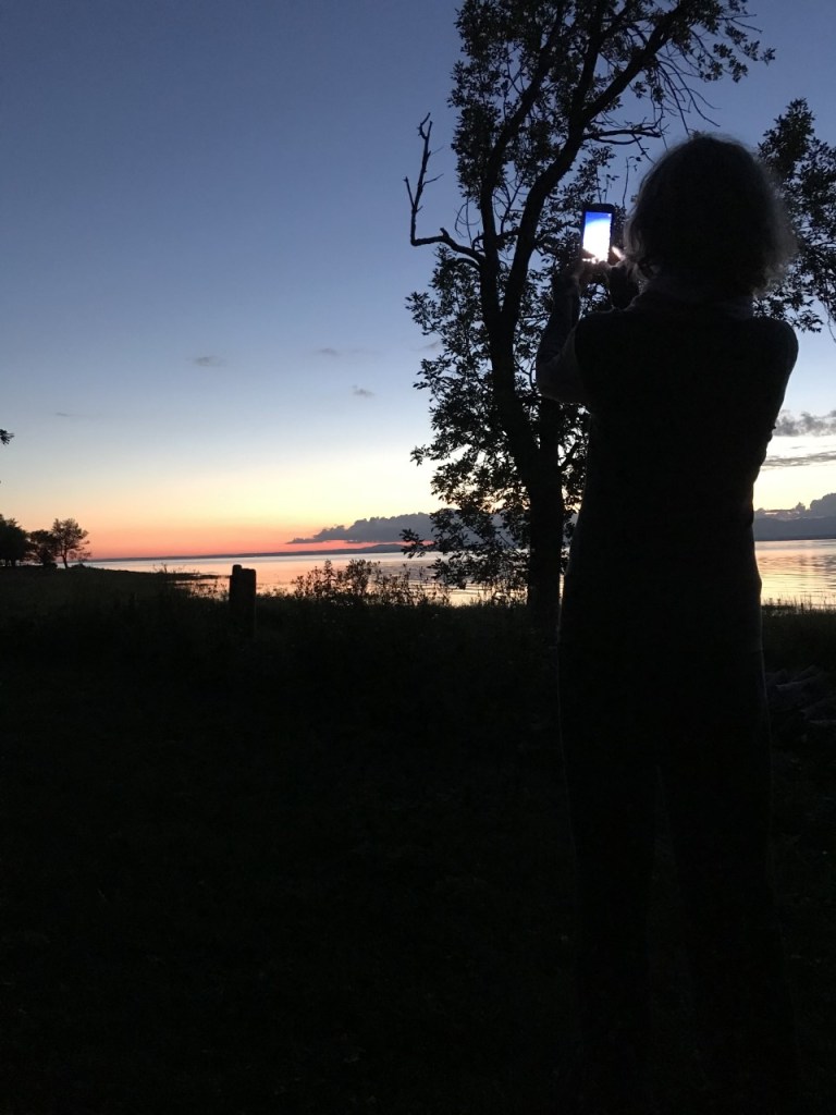 Il y a peu de mots entre nous. Les nuages marchent dans le ciel. D’autres fois, c’est une douche de lumière entre les nuages. Des fois, c’est un rideau blanc derrière l’Île-aux-Oies. Et nous suivons le soleil dans sa descente vers le fleuve. Et les bleus, les rosés, les orangés, les violets, les jaunes qui valsent pour nous. Quand les lumières du coucher de soleil s’éteignent, nous rentrons ivres de cette grande beauté.
