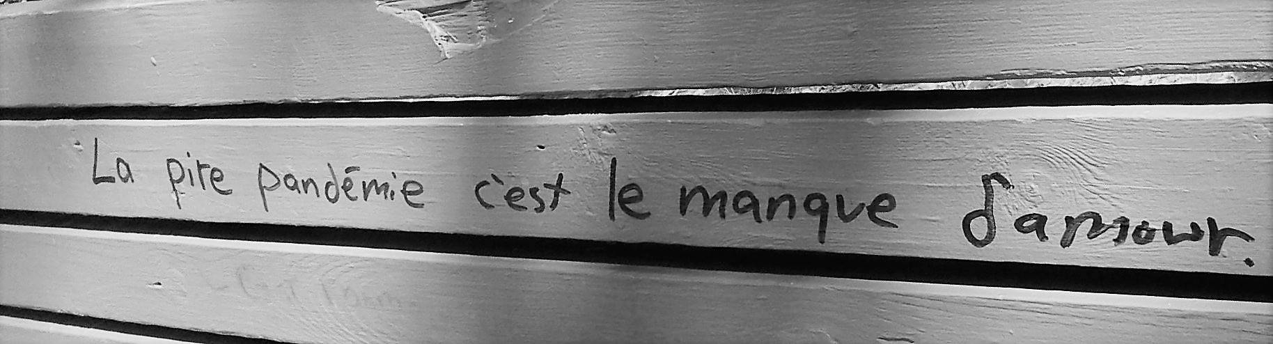 « La pire pandémie c’est le manque d’amour », Inconnu.e / banc du parc-nature de l’Île-de-la-Visitation, Montréal – Été 2021 – photo : Christiane
